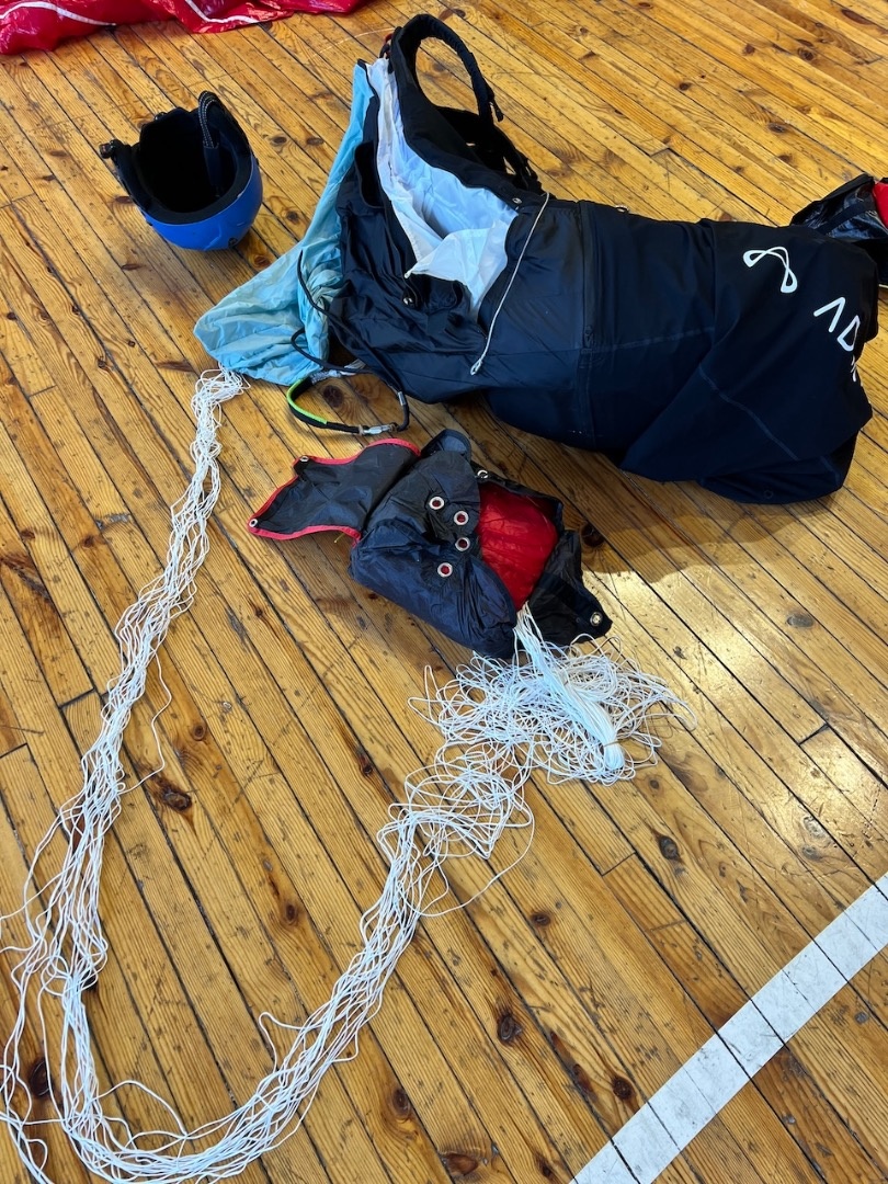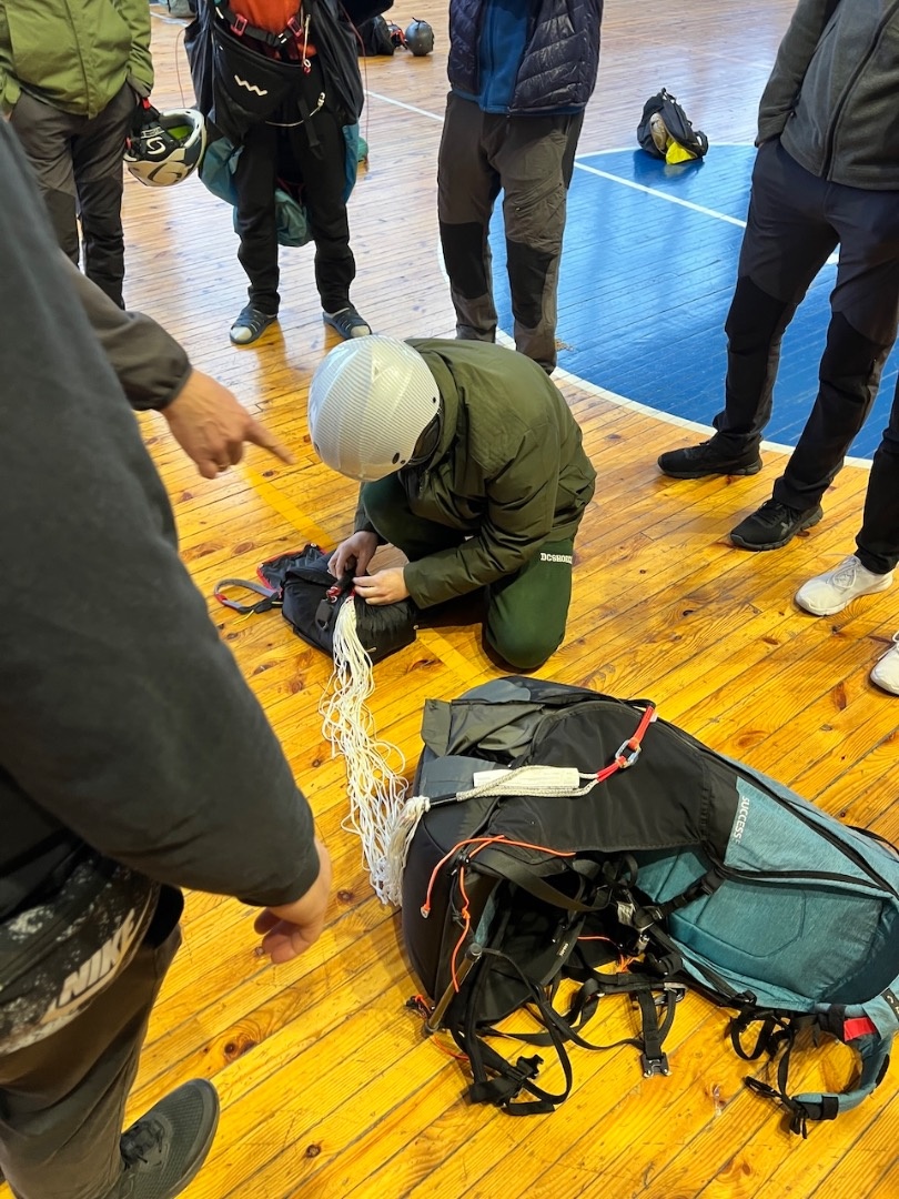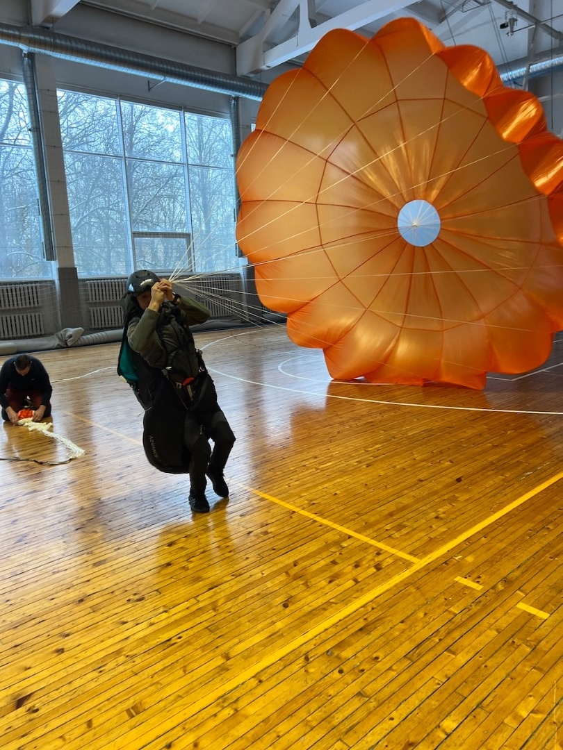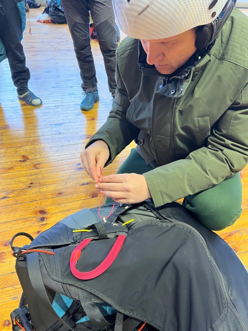 Aizvadījām praktisko nodarbību, kurā trenējām vienu no svarīgākajām drošības prasmēm paraplanierismā - rezerves izpletņa mešanu.